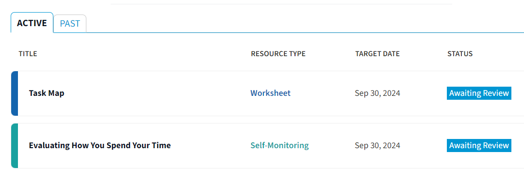On the ACTIVE tab, you’ll see any tasks that have not already been completed and sent to your therapist for review. On the PAST tab, you’ll see all the tasks you’ve already marked as finished.